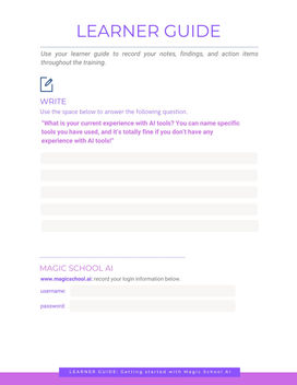 I developed this Instructor-Led Training (ILT) as an introduction to Magic School AI, guiding users through account setup and the creation of a customized rubric. The full training package was built in Canva and includes a professional slide deck, facilitator guide, step-by-step how-to video created in Camtasia, and accompanying learner guide.
